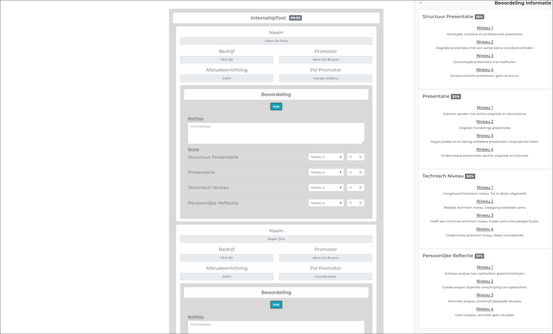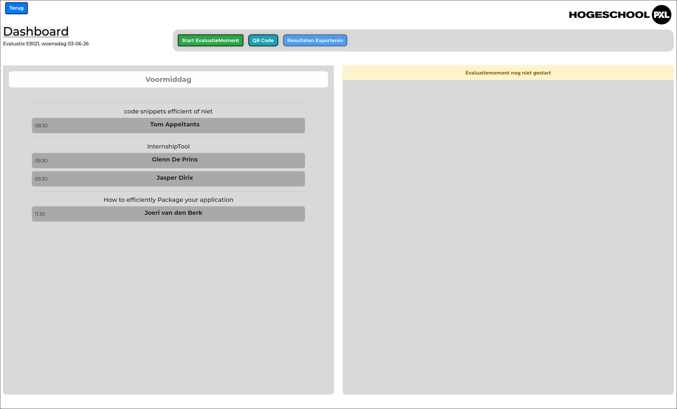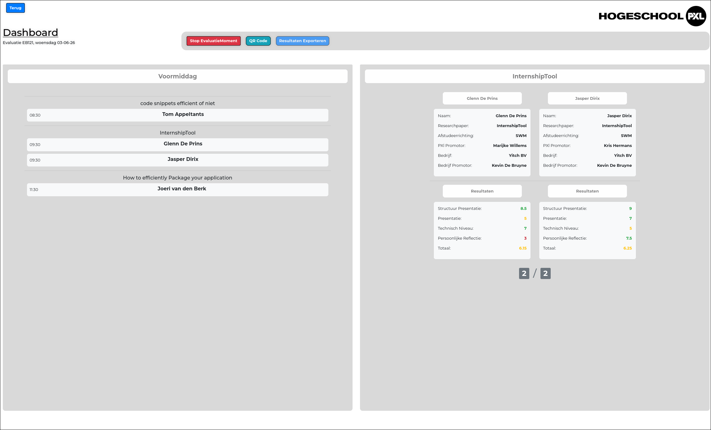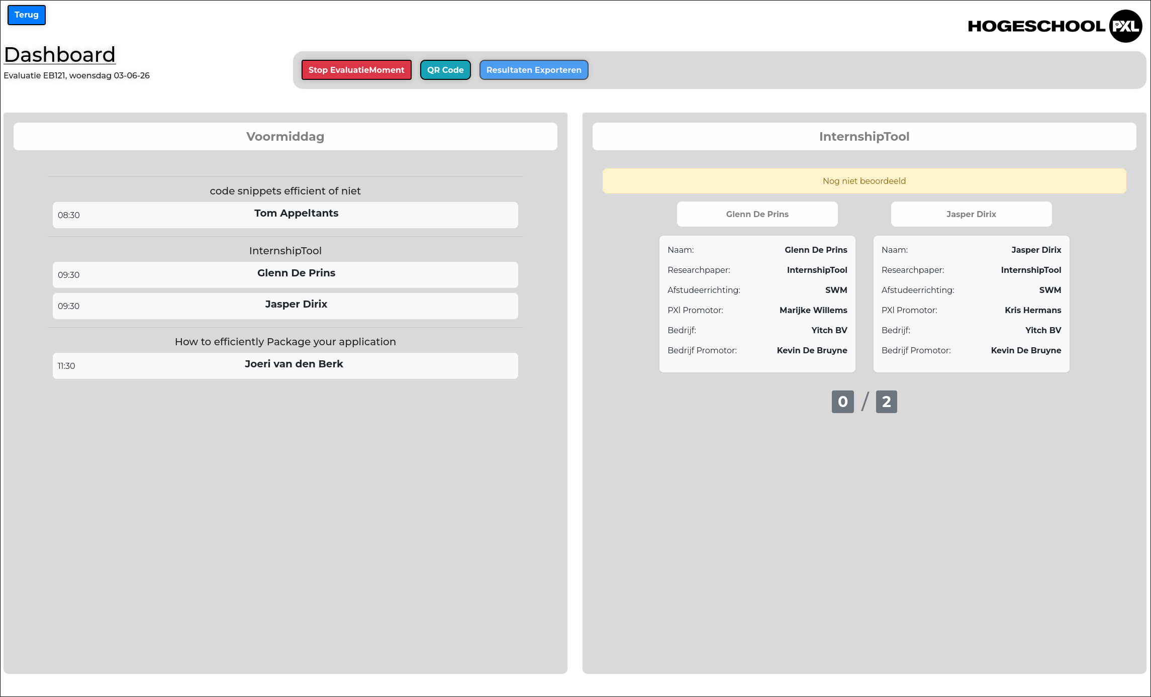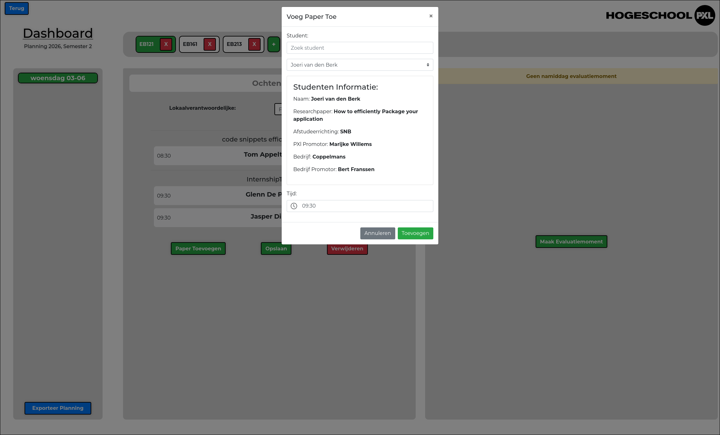 The platform allows staff to plan evaluation moments. From a central dashboard, assign staff members to specific rooms, and oversee the entire examination schedule.